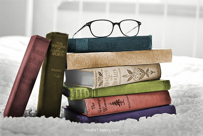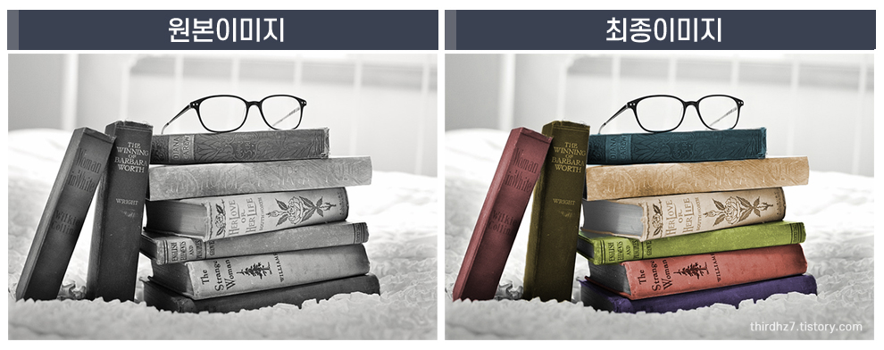 이미지의 부분을 선택하고, 조정 레이어를 통해 색상을 입혀주었습니다. 아래와 같이 쌓여있는 책들을 하나씩 선택하여 색상을 넣어주었습니다. 처음 흑백 이미지와는 또 다른 느낌입니다.