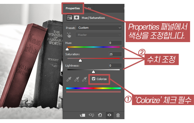 레이어 패널의 조정레이어에서 'Hue/Saturation'을 선택해주면, 아래와 같이 'Properties' 패널이 나타납니다. 여기에서 수치를 조절해주어 색상을 입혀주면 되는데, 조정하기 전에 'Colorize'를 꼭 체크해준 후, 조정해줍니다. 체크해주지 않으면 색상을 자연스럽게 입히기 어려우니, 체크를 해줍니다. 그럼 아래와 같이 선택했던 책에 색상이 입혀집니다.