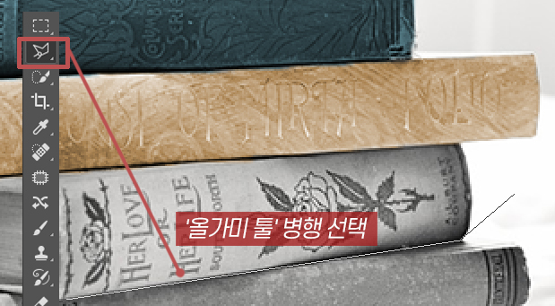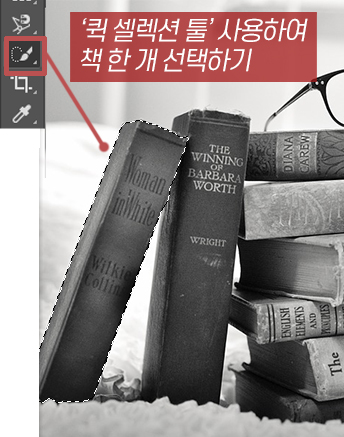 컬러감이 없는 흑백 이미지를 하나 불러오겠습니다. 저는 아래와 같이 책들이 놓여있는 이미지를 불러왔습니다. 전체가 흑백이기 때문에 책 하나씩 선택을 하여 색상을 입혀보겠습니다. 먼저 책의 일부 영역 선택은 포토샵 도구 바에 있는 '퀵 셀렉션 툴'을 사용하여 책을 선택해주겠습니다. 혹은 올가미 툴이나, 자석 올가미 툴 등을 병행하며 사용하여해 주어도 편하게 선택영역을 지정할 수 있습니다.