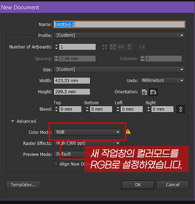 컬러모드 (color mode)를 RGB로 설정해줍니다.