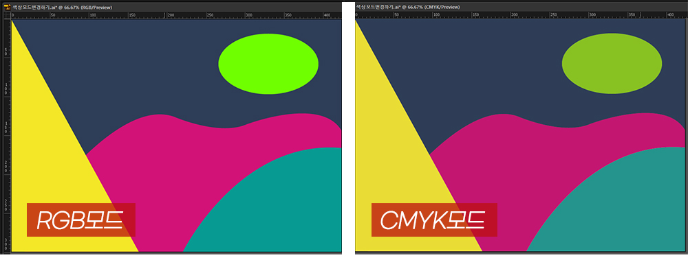 인쇄물 작업 시에는 CMYK 모드로 작업을 해야 컴퓨터로 작업한 색상과 출력된 색상의 차이를 줄일 수 있습니다.